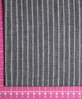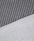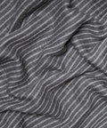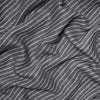 Przepiękny, mięsisty muślin bawełniany w jasne paski na szarym tle. Na lewej stronie tkanina jest w kolorze złamanej bieli.
