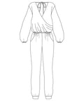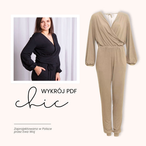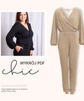 Kombinezon Chic to uniwersalny wykrój, który w zależności od zastosowanej dzianiny, może być wykorzystywany na co dzień w niezobowiązujących okolicznościach lub w wersji bardziej eleganckiej. Jego cechy charakterystyczne to kopertowy przód, dekolt na plecach, wiązanie z tyłu , gumka w pasie umożliwiająca regulację stopnia dopasowania do obwodu oraz wygodne nogawki zakończone ściągaczami.