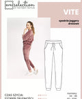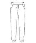 Wykrój na dopasowane i wygodne spodnie dresowe z delikatnie obniżonym krokiem, ściągaczami na górze i dole nogawek oraz kieszeniami z półokrągłym wlotem.