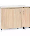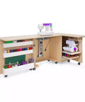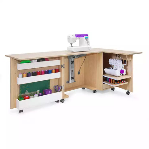 TEXI SESAME DUO w kolorzejasnego dębu zapewnia funkcjonalną przestrzeń do przechowywania maszyny wieloczynnościowej, overlocka i akcesoriów krawieckich.
