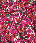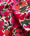 Mięsista i przyjemna w dotyku tkanina wiskozowa o składzie 97% wiskoza 3% elastan z przepięknym kwiatowym printem w odcieniach różu, czerwieni i zgaszonej zieleni na tle w kolorze ecru. Materiał jest bardzo przyjemny w chwycie, mięsisty, lejący. Rozciąga się po szerokości, ma delikatnie widoczną strukturę. Idealny materiał na kimono, sukienkę czy spódnicę, a także spodnie czy bluzki i koszule. Przewiewna tkanina o naturalnych właściwościach. Nie prześwituje, nie wymaga podszewki, lekko się gniecie. Dzięki dodatkowi elastanu nadaje się na projekty dedykowane dla dzianiny.