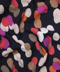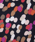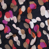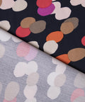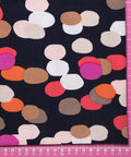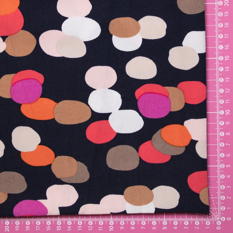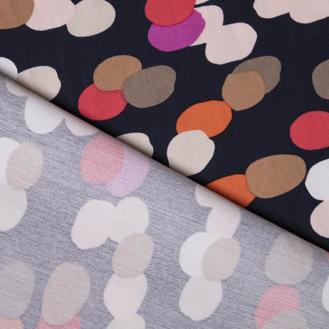Tkanina wiskozowa o strukturze twillu. Tkanina o składzie 93% wiskoza i 7% poliester o wzorze w kolorowe stemple na tle navy.