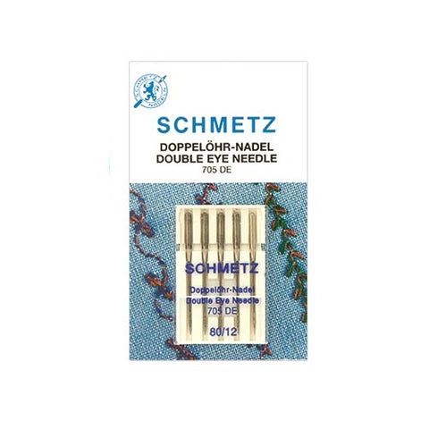 Igły Schmetz 705 DE z podwójnym oczkiem, używane do ściegów dekoracyjnych. Specjalnie skonstruowana igła do haftowania i szycia ściegiem stebnowym za pomocą dwóch nici naraz. Łącząc dwa bardzo kontrastowe kolory nici można osiągnąć ciekawy, melanżowy efekt, np. cienia. Półpłaska kolba, 5 szt., grubość 80. System igieł: 705 DE.
