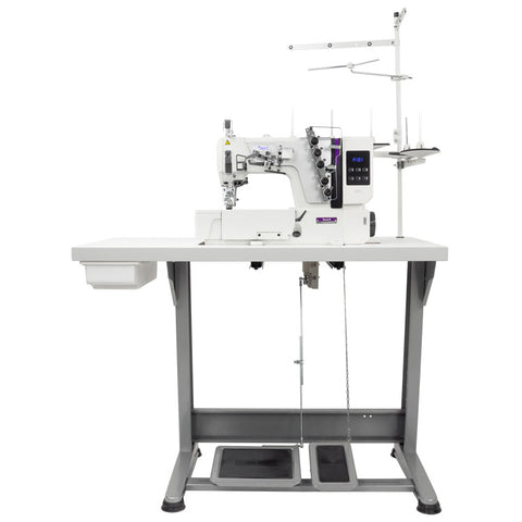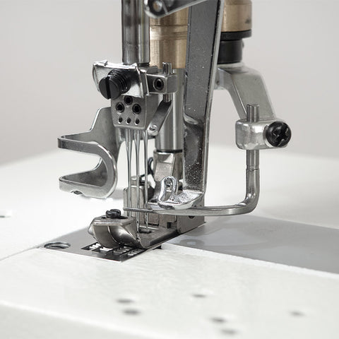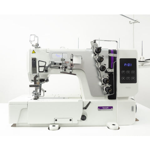 Interlok Texi Treccia Premium to 3-igłowy, 5-nitkowy interlok o płaskim łożu (zwany również kapówką lub renderką). Niezbędny przy produkcji odzieży. Seryjnie jest wyposażony w rozstaw igieł 5,6mm. W komplecie znajduje się dodatkowy rozstaw 6,4mm składający się ze stopki, płytki ściegowej, transportera przedniego, transportera tylnego oraz uchwytu igieł.