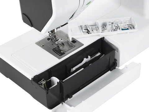 Duże pole pracy zawdzięczamy nie tylko większej odległości ramienia od igielnicy, która w tym modelu wynosi aż 23 cm, ale również załączonemu do zestawu stolikowi zwiększającemu przestrzeń z lewej strony maszyny. Takie rozwiązanie sprawia że model ten idealnie sprawdzi się podczas pikowania, szycia patchworku czy tworzeniu innych prac o większym gabarycie.