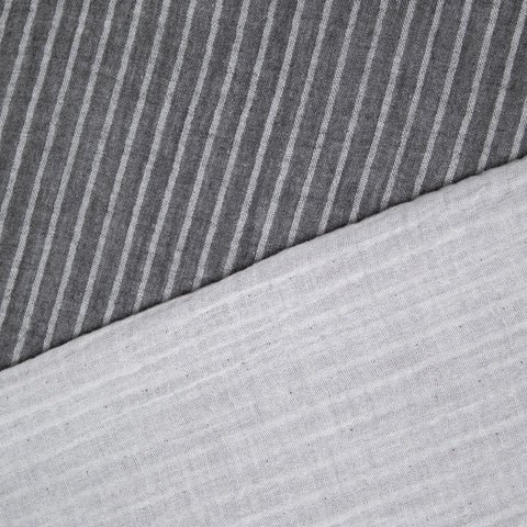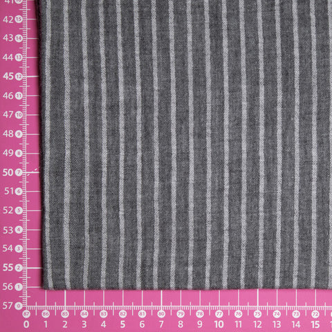 Przepiękny, mięsisty muślin bawełniany w jasne paski na szarym tle. Na lewej stronie tkanina jest w kolorze złamanej bieli.