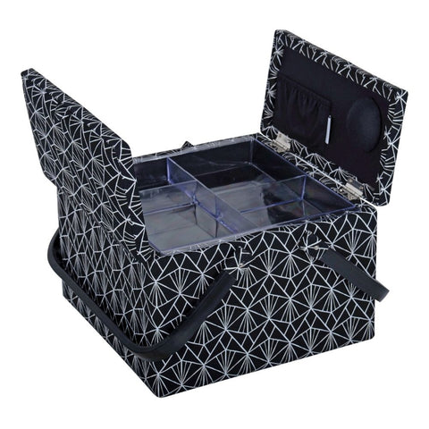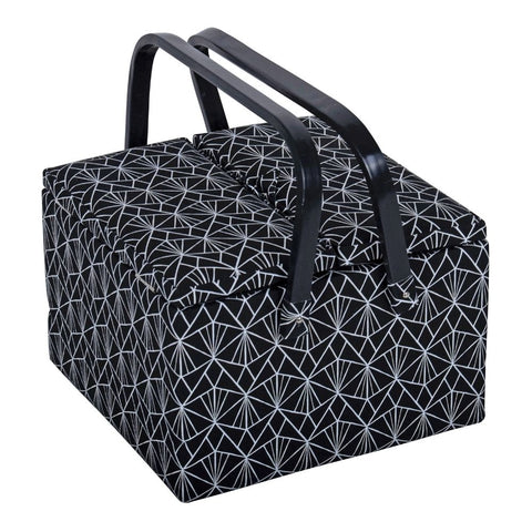 Materiałowe i wzorzyste wykończenie sprawia, że przybornik będzie świetnie wyglądał oraz pozwoli zachować porządek, zarówno w krawieckim atelier jak i w domowej pracowni.