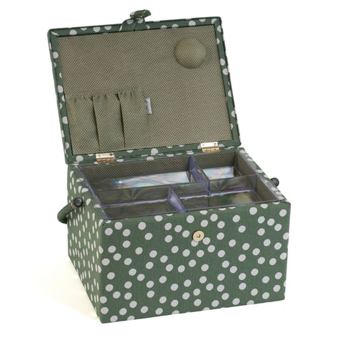 Materiałowe i wzorzyste wykończenie sprawia, że przybornik będzie świetnie wyglądał oraz pozwoli zachować porządek, zarówno w krawieckim atelier jak i w domowej pracowni.