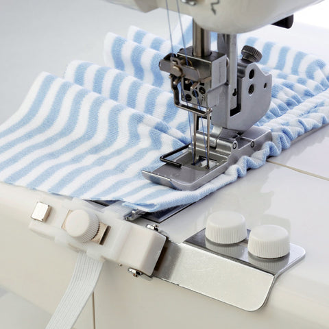 Wysokiej klasy prowadnik do wszywania gumy w prosty sposób pozwala przyszyć (wszyć) gumę lub elastyczną taśmę z jednoczesnym marszczeniem materiału. Przydaje się podczas szycia odzieży, szczególnie sportowej, dziecięcej, a także bielizny. Pozwala wszyć kawałek gumy np. w talii sukienki lub w mankiecie bluzki i dzięki temu uzyskać element, który będzie jednocześnie praktyczny i ozdobny. Wielkość marszczenia można dostosować poprzez regulację siły docisku prowadnika. Efekt marszczenia zależy też od rodzaju i jakości gumy.
