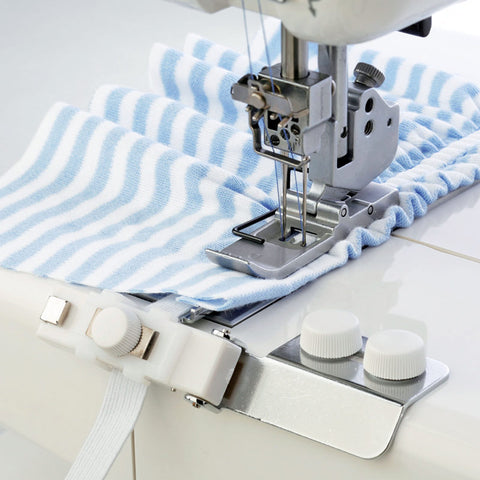 Wszycie (przyszycie) gumy czy elastycznej taśmy nie będzie żadnym problemem po zastosowaniu tego prowadnika w coverze. Takie ułatwienie docenią osoby szyjące bieliznę oraz odzież, szczególnie dziecięcą. Prowadnik umożliwia wszycie kawałka gumy np. w talii sukienki lub w mankiecie. Stworzone w ten sposób marszczenie jest równomierna i bardzo estetyczne. Wielkość marszczenia można dostosować poprzez regulację siły docisku prowadnika. Efekt marszczenia zależy też od rodzaju (jakości) gumy.