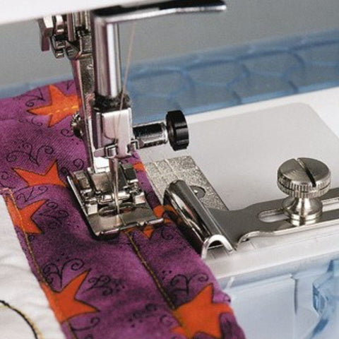 Specjalny, montowany do ramienia maszyny prowadnik krawędziowy umożliwiający zachowanie idealnie równej odległości ściegu od krawędzi materiału.