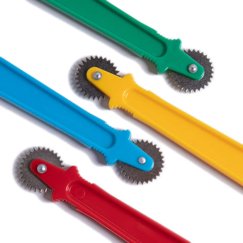Radełko metalowe z plastikową rączką do przenoszenia wykrojów na papier. Wygodna alternatywa dla odrysowywania, ułatwia wycięcie wykroju. Długość 12 cm, średnica radełka 22mm