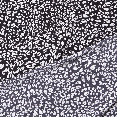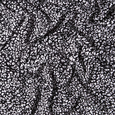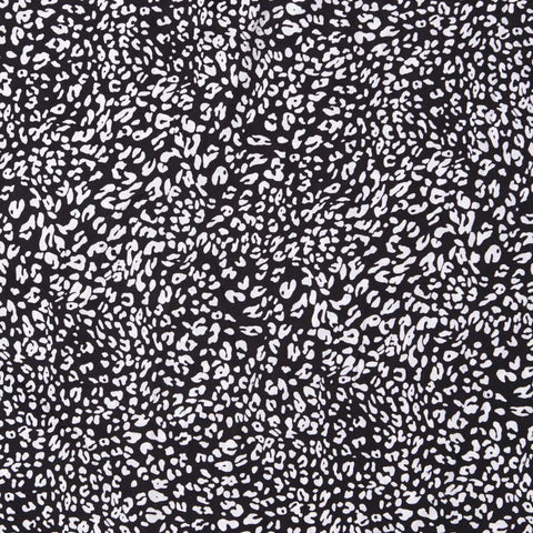 Tkanina syntetyczna o składzie 100% poliester z nadrukiem w białe cętki na czarnym kolorze. Idealna na sukienkę, bluzkę, tunikę, koszulę, kombinezon, spódnicę z falbanami, spódnicę z koła, chusty i apaszki. Przewiewna tkanina, przyjemna w chwycie, miękka, lejąca się, o żorżetowej strukturze. Nie prześwituje, nie wymaga podszewki, nie gniecie się.