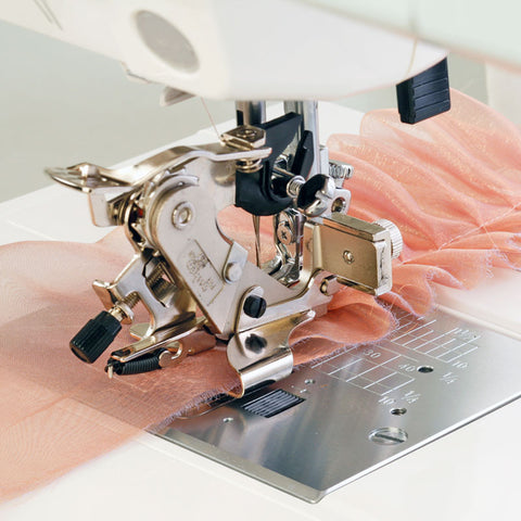 Wyjątkowa stopka, przeznaczona do wykonywania perfekcyjnych falbanek, zakładek czy dokładnego marszczenia. Jej specjalny, ostro zakończony element zapewnia dokładne zbieranie materiału, bez przepuszczania. Regulacja częstotliwości zbierania pozwoli na wybór kilku różnych trybów pracy. Nastawienie na pozycję 1 umożliwi uzyskanie gęstej falbany lub marszczenia. Pozycje 6 i 12 posłużą do uzyskania rzadszych, ozdobnych zakładek. Z kolei nastawienie dźwigni regulacyjnej w pozycji oznaczonej gwiazdką pozwoli na stebnowanie bez zbierania materiału. Jednocześnie możemy mieć wpływ na głębokość (szerokość) wykonywanych falbanek czy zakładek. Specjalna śrubka pozwoli nastawić tę wartość w zakresie pomiędzy 1 a 8 mm. Uzyskane przy użyciu stopki falbanki i zakładki mogą pięknie ozdobić wykonywane sukienki, bluzki, zasłony czy dekoracyjne narzuty. Końcowy efekt może różnić się, w zależności od szytego materiału. Szyjąc sztywne materiały warto delikatnie zwilżyć je przed rozpoczęciem pracy. Zalecamy również wykonanie próby na skrawku materiału.