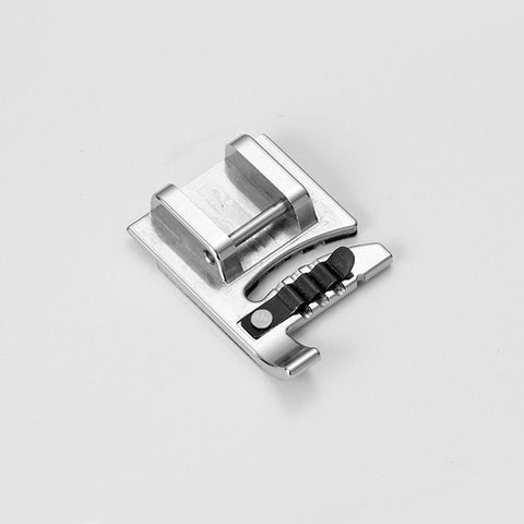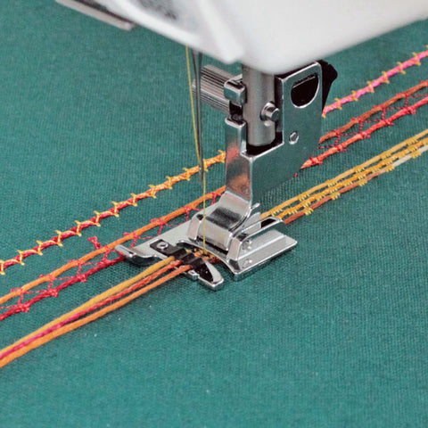 Wyjątkowa stopka przeznaczona do wszywania ozdobnych sznurków o maksymalnej średnicy 1.5 mm. Dzięki specjalnemu prowadnikowi i rowkom na spodzie stopki wszywanie sznurków jest znacznie prostsze, a uzyskane efekty dokładne i estetyczne. Stopka pozwoli na wszywanie 1, 2 lub nawet 3 sznurków jednocześnie. Mogą one spełniać rolę dekoracyjną na tkaninie, jak i posłużyć do uwypuklenia np. gęstego ściegu zygzakowego. Stopka sprawdzi się zarówno podczas szycia prosto, jak i po łukach. Z powodzeniem można również zastosować igłę podwójną dla uzyskania oryginalnych dekoracji.