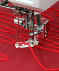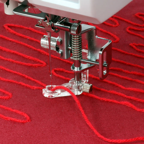 Stopka dzięki której z łatwością naszyjesz na materiał ozdobny sznurek lub włóczkę, tworząc piękne i niepowtarzalne dekoracje. Stopka sprawdzi się również podczas wykonywania wzorzystego pikowania. Uzyskane z nią efekty mogą ozdobić poszewki, narzuty, pokrowce czy nawet odzież. Stopka posiada dwie wymienne końcówki, które umożliwiają naszywanie włóczki/sznurka o średnicy do 1.5 mm oraz między 1.5 a 2 mm.