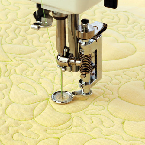 Stopka nowej generacji pozwalająca na uzyskanie płynnej linii i dobrej jakości ściegu podczas szycia w dowolnym kierunku. Wykorzystamy ją do tworzenia pięknych pikowań (np. echo, kamienie, lot trzmiela) oraz przy jej pomocy stworzymy hafty z wolnej ręki (technika zwana malowaniem nićmi). Stopka poza ozdabianiem przyda się podczas wykonywania napraw, czyli przy cerowaniu.