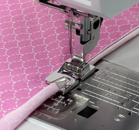 Za właściwe podwijanie materiału odpowiada przede wszystkim spiralny prowadnik w stopce, w który wsuwany jest materiał. Z kolei 6-milimetrowy rowek w spodniej części stopki pozwala na odpowiednie ułożenie materiału po przeszyciu. Cała stopka jest metalowa i bardzo solidna. Prowadnik nie odkształca się.