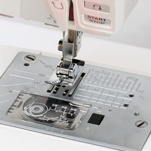 Mały otwór w stopce i płytce ściegowej sprawia, że podczas szycia cienkich, delikatnych tkanin (jak batyst czy jedwab) nie wpadają one (nie są wciągane) w płytkę ściegową w trakcie szycia. Powstały ścieg jest idealnie równy i gładki. Natomiast w przypadku grubych, zbitych materiałów, igle jest łatwiej przebić się przez ich strukturę materiału. Dodatkowo na płytce ściegowej znajdują się oznaczenia umożliwiające równe szycie od krawędzi materiału w przedziale od 1 do 4,5 cm oraz kąty 45, 60, 90 oraz 120 (pomocne podczas łączenia elementów patchworkowych).