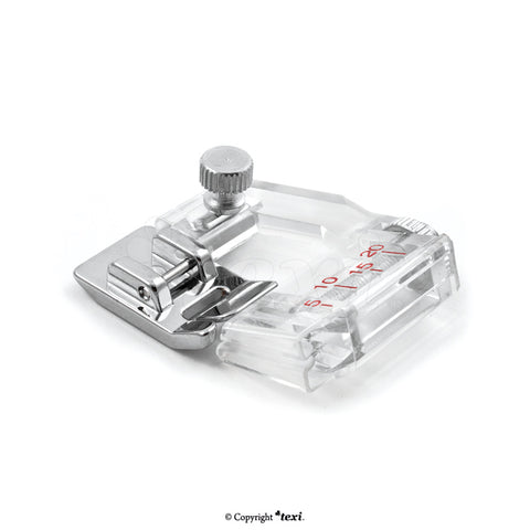 Stopka MATIC szybkowymienna do wszywania zaprasowanej lamówki. Regulacja szerokości zaprasowanej lamówki w zakresie od 5 do 20 mm. Specjalna konstrukcja zapewnia dokładne prowadzenie lamówki i jej precyzyjne wszycie.