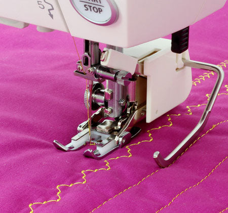 Zastosowanie stopki podczas szycia ułatwia płynne podawanie materiału, dzięki czemu przeszywanie odbywa się bez przesuwania i marszczenia zszywanych warstw, a dołączony prowadnik pomaga wykonać równoległe stębnowanie. Dzięki temu, że stopka jest otwarta, zapewnia bardzo dobrą widoczność podczas szycia np. ściegami ozdobnymi.