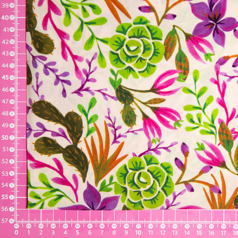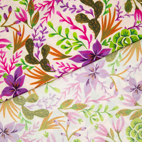 Przyjemna w dotyku tkanina ecovero, gładka w kolorze brzoskwiniowm z przepięknym, kolorowym printem w sukulenty, w kolorach fuksji, fioletu i zieleni. Ecovero to ekologiczna tkanina produkowana przez firmę Lenzing. Jest to rodzaj wiskozy, ale bardziej przyjazny dla środowiska niż tradycyjna wiskoza. Ecovero powstaje z certyfikowanej celulozy drzewnej, głównie z lasów zarządzanych w sposób zrównoważony. Proces produkcji tej tkaniny zużywa do 50% mniej wody i energii w porównaniu do zwykłej wiskozy, jest biodegradowalna. Podsiada certyfikat EU Ecolabel, będący gwarancją niskiego wpływu na środowisko. Materiał jest bardzo przyjemny w chwycie, lejący, przewiewny. To idealna propozycja zwłaszcza na letnie ubrania - spódnice i sukienki, koszule, bluzki, kimona, topy. Świetnie sprawdzi się w odzieży z falbanami. Przewiewna tkanina o naturalnych właściwościach. Nie prześwituje, nie wymaga podszewki, lekko się gniecie.