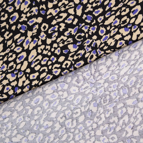 Tkanina wiskozowa cętki w odcieniach beżu i chabru na czerni o składzie 100% wiskoza. Przewiewna i przyjemna dla skóry. Nadaje się zarówno na ubrania wiosenne, letnie, jak i jesienne.