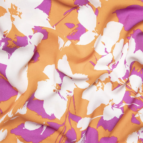 Tkanina wiskozowa o składzie 100% wiskoza w duży kwiatowy wzór w kolorze bieli, pomarańczowym i fuksji. Idealna na sukienkę, bluzkę, tunikę, koszulę, kombinezon, spódnicę z falbanami, spódnicę z koła, chusty i apaszki. Przewiewna tkanina o naturalnych właściwościach, idealna na wiosnę, lato, jesień. Przyjemna w chwycie, miękka, lejąca się. Lekko prześwituje.
