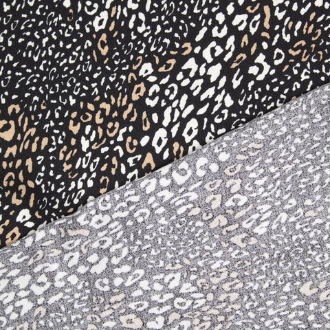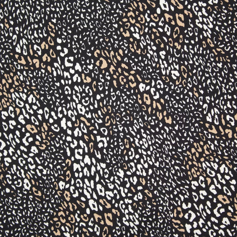 Tkanina wiskozowa krepowana w drobny zwierzęcy wzór na czerni. Przewiewna i przyjemna dla skóry. Nadaje się zarówno na ubrania wiosenne, letnie, jak i jesienne.