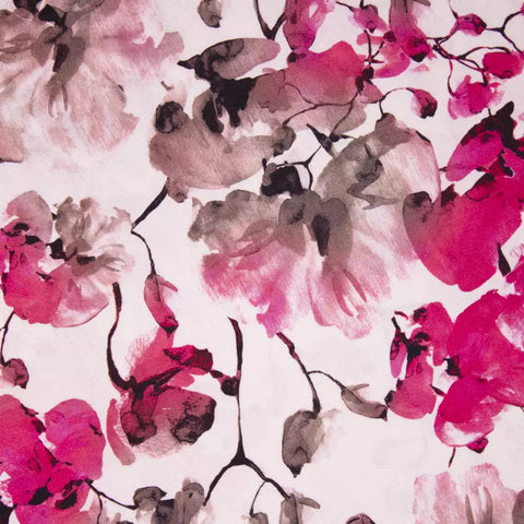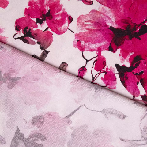 Tkanina wiskozowa o składzie 100 % wiskoza w różowe akwarelowe kwiaty na ecru. Idealna na sukienkę, bluzkę, tunikę, kombinezon, spódnicę z falbanami, spódnicę z koła, chusty i apaszki. Przewiewna tkanina o naturalnych właściwościach, idealna na wiosnę, lato, jesień. Przyjemna w chwycie, miękka, lejąca się. Lekko prześwituje.