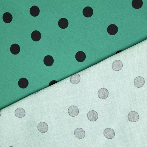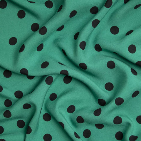 Tkanina wiskozowa o składzie 100% wiskoza o wyraźnym splocie w czarne grochy na zieleni. Idealna na sukienkę, bluzkę, tunikę, koszulę, kombinezon, spódnicę z falbanami, spódnicę z koła, chusty i apaszki. Przewiewna tkanina o naturalnych właściwościach, idealna na wiosnę, lato, jesień. Przyjemna w chwycie, miękka, lejąca się, gładka.
