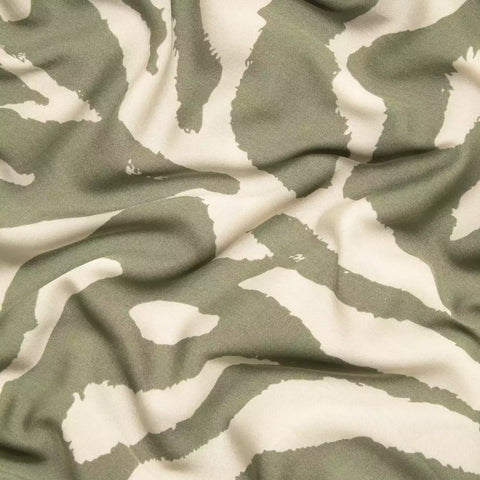 Tkanina wiskozowa o składzie 100% wiskoza z motywem zwierzęcym w kolorach zgaszonej zieleni jasnego beżu. Widoczny splot. Idealna na sukienkę, bluzkę, tunikę, koszulę, kombinezon, spódnicę z falbanami, spódnicę z koła, chusty i apaszki. Przewiewna tkanina o naturalnych właściwościach, idealna na wiosnę, lato, jesień. Przyjemna w chwycie, miękka, lejąca się.