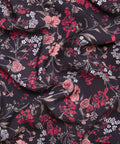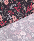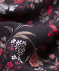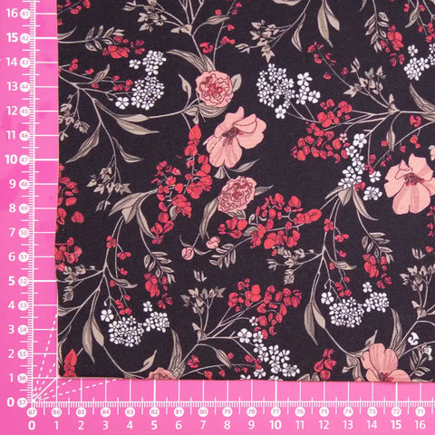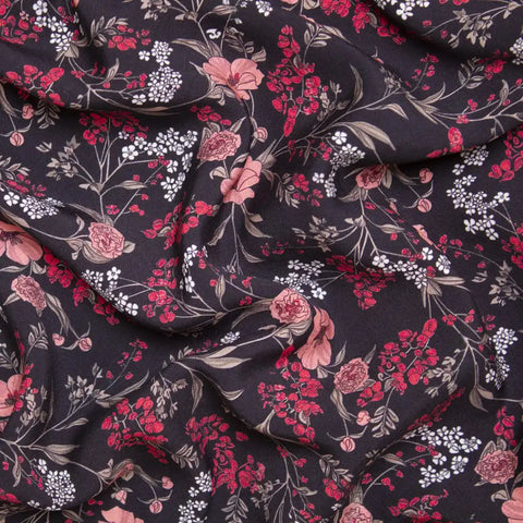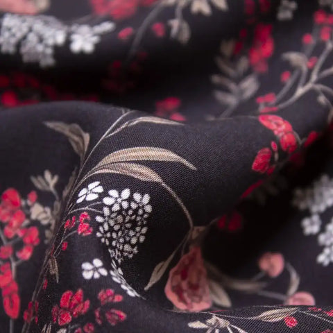 Przyjemna w dotyku tkanina wiskozowa o składzie 100% wiskoza w przepiękne, delikatne kwiaty w odcieniach czerwieni na czarnym tle. Materiał jest bardzo przyjemny w chwycie, gładki, lejący. Idealny materiał na kimono, sukienkę czy zwiewną spódnicę, a także letnie spodnie czy bluzki i koszule. Świetnie sprawdzi się przy okazji projektów z falbanami. Przewiewna tkanina o naturalnych właściwościach. Nie prześwituje, nie wymaga podszewki, lekko się gniecie.