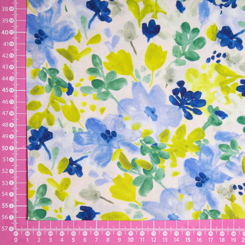 Mięsista i przyjemna w dotyku tkanina wiskozowa o składzie 97% wiskoza 3% elastan z przepięknym kwiecistym printem w odcieniach limonki, błękitu i granatu, na tle w kolorze ecru. Materiał jest bardzo przyjemny w chwycie, lejący. Rozciąga się po szerokości, jest gładki. Idealny materiał na kimono, sukienkę czy spódnicę, a także letnie spodnie czy bluzki i koszule. Przewiewna tkanina o naturalnych właściwościach. Nie prześwituje, nie wymaga podszewki, lekko się gniecie. Dzięki dodatkowi elastanu nadaje się na projekty dedykowane dla dzianiny.