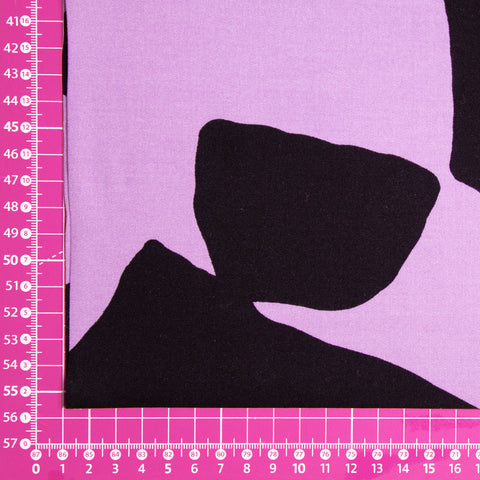 Mięsista i przyjemna w dotyku tkanina wiskozowa o składzie 97% wiskoza 3% elastan z przepięknym geometrycznym printem w odcieniach lawendy i czerni. Materiał jest bardzo przyjemny w chwycie, mięsisty, lejący. Rozciąga się po szerokości, jest gładki. Idealny materiał na kimono, sukienkę czy spódnicę, a także letnie spodnie czy bluzki i koszule. Przewiewna tkanina o naturalnych właściwościach. Nie prześwituje, nie wymaga podszewki, lekko się gniecie. Dzięki dodatkowi elastanu nadaje się na projekty dedykowane dla dzianiny.