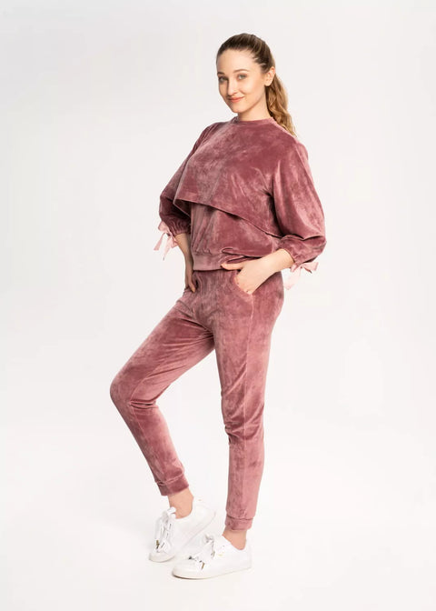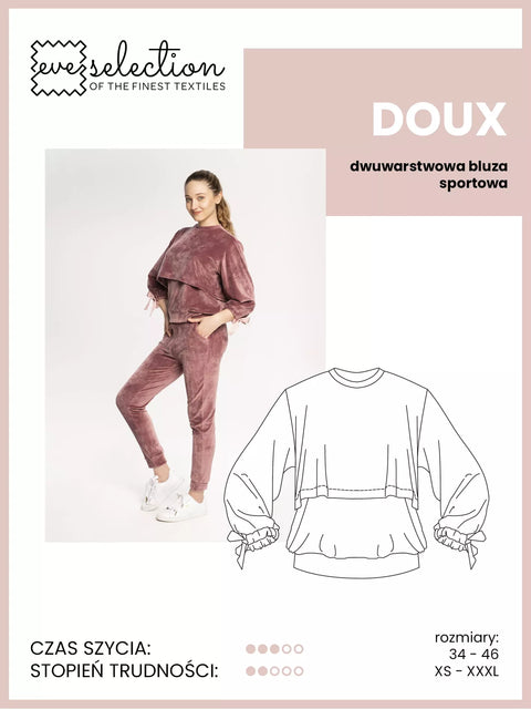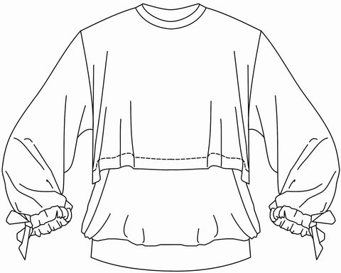 Jeden projekt i kilka możliwości – w ramach tego wykroju możesz uszyć klasyczną bluzę dresową z długim rękawem i ściągaczami oraz dwuwarstwową bluzę z krótszą warstwą zewnętrzną. Dwa wykroje góry pozwalają na wykorzystanie formy również do uszycia różnych wariantów tunik i sukienek rozszerzanych. Jedyny dopuszczalny materiał to dzianina, rekomendowana dresówka pętelka o gramaturze do maks. 300 g oraz welur do 450 g.
