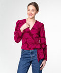Wykrój na bluzkę kopertową Lettre. Wiązana wewnątrz na troczek z możliwością dopasowania do sylwetki, na zewnątrz wiązana ozdobną szarfą. Ramiona bluzki posiadają delikatne bufki. Zaprojektowana została w taki sposób, żeby przy schylaniu wszystko zostawało na swoim miejscu, dzięki wszytemu zatrzaskowi :) Model do szycia z tkanin, nieco sztywniejszych i zarazem lekkich. Takich, które zachowują formę bufiastych rękawów: len, mieszanki lnu z wiskozą, muślin, tkaniny bawełniane.