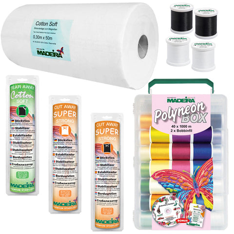 W zestawie L otrzymasz dodatki renomowanej firmy Madeira, idealne dla miłośników haftowania na maszynie. Bardzo duży wybór nici, flizelin, wzorów haftów oraz igieł to coś, co docenią doświadczeni użytkownicy hafciarek, ale również początkujący.