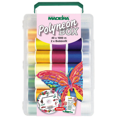 Komplet 40 kolorów nici do haftu Madeira Polyneon 40 plus 2 szpulki nici spodniej Madeira oraz dodatki. Madeira Polyneon 40 (tu na szpulkach o nawoju 1000 metrów każda) to najbardziej uniwersalny typ nici hafciarskich, idealnych do wielu zastosowań. Swoją uniwersalność i popularność zawdzięczają bardzo wysokiej odporności na zrywanie i trwałości - nawet po wielokrotnym praniu nie odbarwiają się, zachowując wyrazisty i pełen połysku kolor. W zestawie znalazły się ponadto 2 szpulki nici spodniej Madeira w kolorze białym oraz bonusy: kolekcja 82 haftów na płycie CD i opakowanie 5 sztuk uniwersalnych igieł do haftowania. Zestaw jest sprzedawany w praktycznym pudełku z tworzywa sztucznego, które pomaga w przechowywaniu oraz przenoszeniu dodatków.