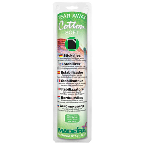Flizelina hafciarska wydzierana Madeira Cotton Soft (biała; 30 cm x 10 m) to mniejsza wersja przedstawionego powyżej stabilizatora wydzieralnego Madeira Cotton Soft na 50-metrowej rolce. Ta flizelina jest czarna i jest sprzedawana w opakowaniu zawierającym 10 metrów tego bardzo ważnego i często używanego dodatku hafcirarskiego.